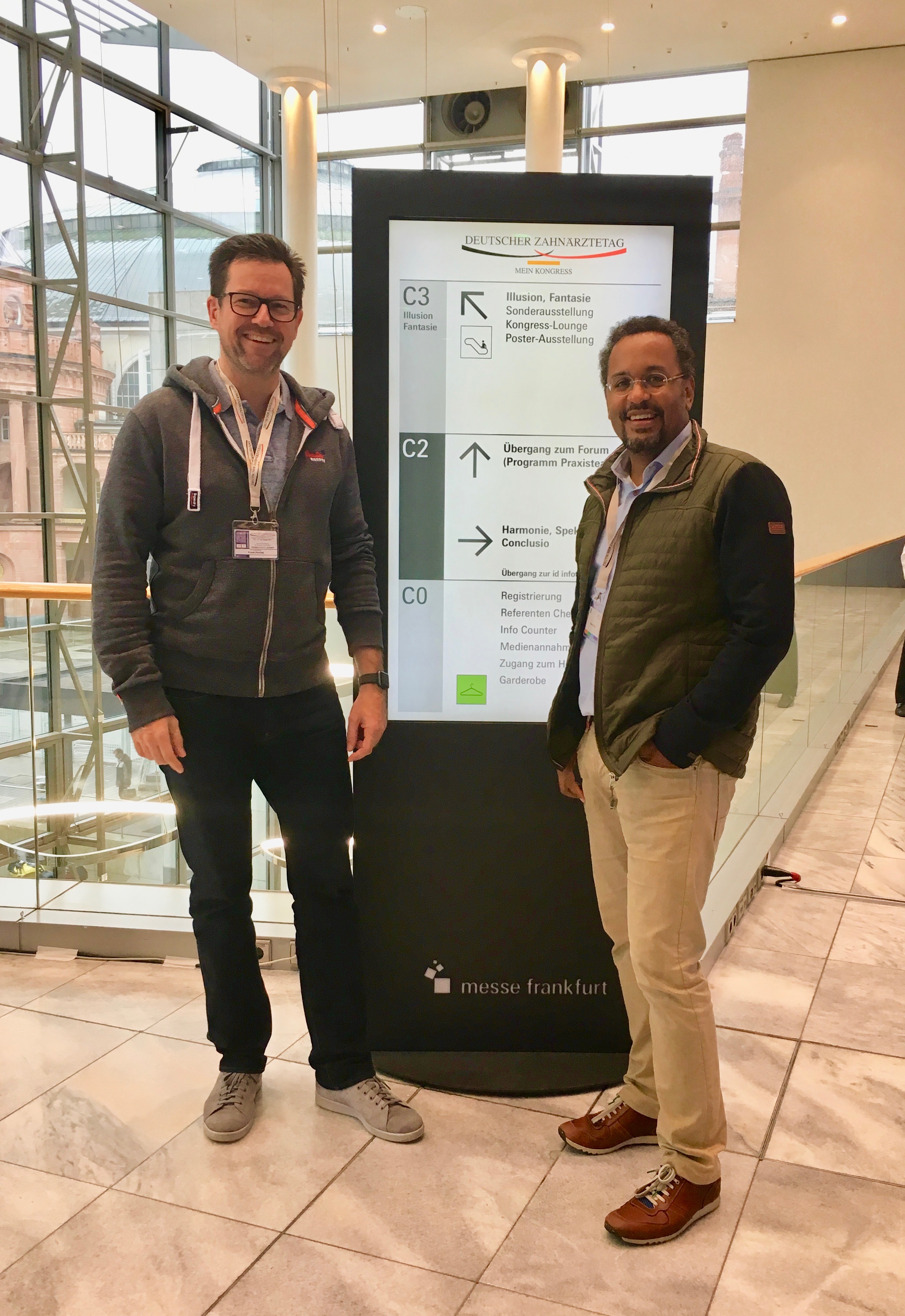 Dr. Pawlak mit seinem Kollegen Dr. Laja beim Deutschen Zahnärztetag in Frankfurt 2017. Auf dem Kongress wurden aktuelle Themen zur Zahnerhaltung, Parodontitistherapie, Kinderzahnheilkunde und Implantologie aus dem Praxisalltag und der Wissenschaft präsentiert.